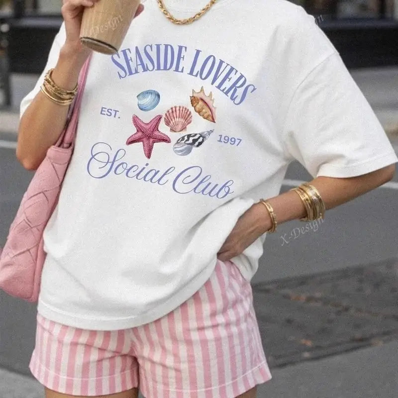 Retro Vintage Fun Starfish Shell Print Tshirt INS Style Loose Fit Short Sleeved Graphic Top Cotton Women T-shirt Female Clothing